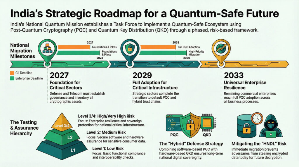The Department of Science and Technology (DST), Govt of India has established a Task Force under the National Quantum Mission (NQM) to secure the nation’s digital infrastructure against “Harvest Now, Decrypt Later” (HNDL) threats. This transition is not a routine upgrade; it represents a fundamental shift in digital trust, moving from research pilots toward structured national deployment. We will analyse the report of the task force on Implementation of Quantum Safe Ecosystem in India.