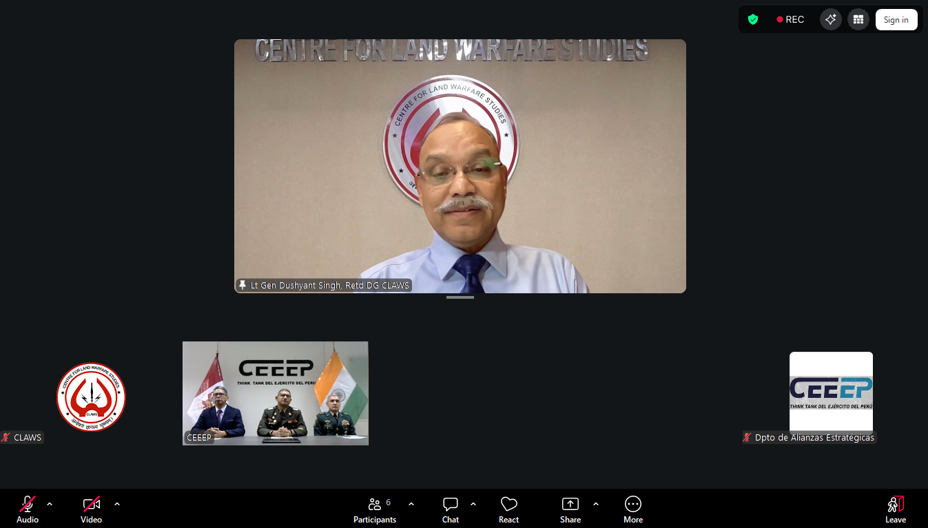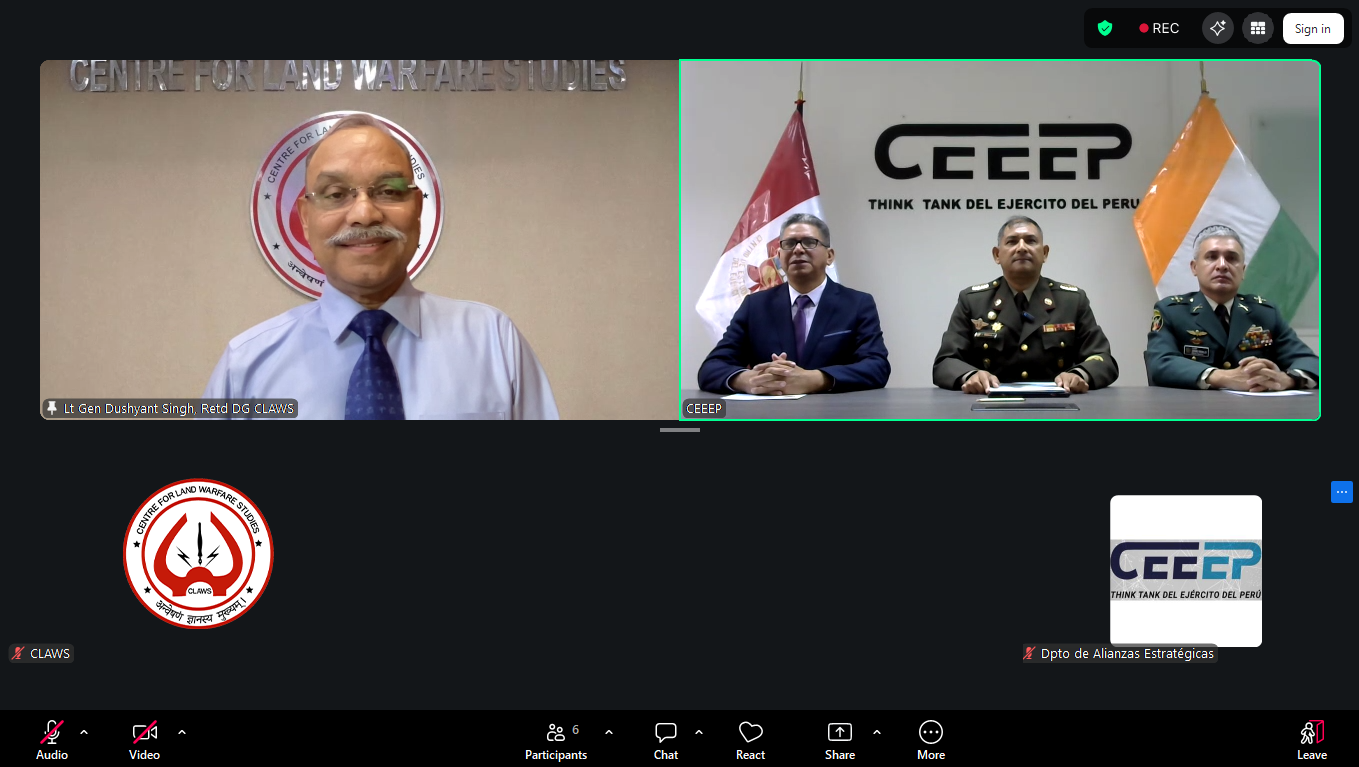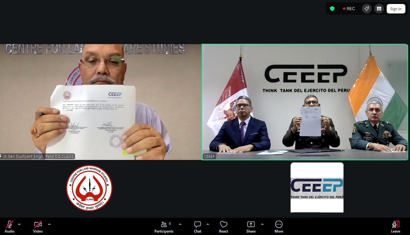 A landmark moment in global strategic engagement The Centre for Land Warfare Studies (CLAWS) and the Peruvian Army’s Centro de Estudios Estratégicos del Ejército del Perú (CEEEP) have formalised a prestigious MoU through a virtual signing ceremony, ushering in a dynamic new era of collaboration in strategic research, intellectual exchange and defence dialogue